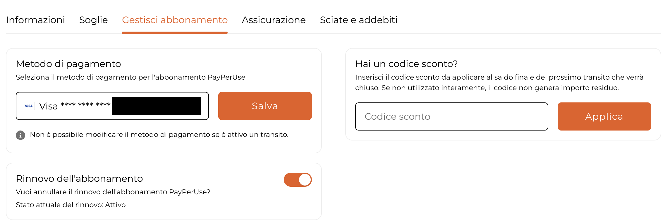 Gestire il rinnovo automatico del tuo abbonamento Pay Per Use 22 novembre 2025 11:02 Aggiornato Il rinnovo automatico per l'abbonamento PayPerUseSOLO per il prodotto PayPerUse, l'abbonamento verrà rinnovato automaticamente all' inizio della stagione il giorno 1 Novembre di ogni anno. Non ci sono rinnovi automatici per abbonamenti stagionali.Tutti gli abbonamenti PayPerUse vengono venduti col rinnovo automatico attivo!Se si ha sottoscritto un abbonamento PayPerUse tramite promozioni che ne hanno abbassato il prezzo, il rinnovo successivo sarà al prezzo di listino standard.Per annullare il rinnovo automatico dalla sezione I miei Abbonamenti(cliccando Dettagli --> Gestisci Abbonamento) si potrà disdire/abilitare il rinnovo automatico dell'abbonamento sulla card in interesse.Questa operazione può essere fatta in qualsiasi momento e non comporta la disattivazione delle funzionalità dell'abbonamento per la stagione in corso.Per altri informazioni sul prodotto PayPerUse: Come funziona il PayPerUse? Correlato a payperuse abbonamento ppu rinnovo automatico